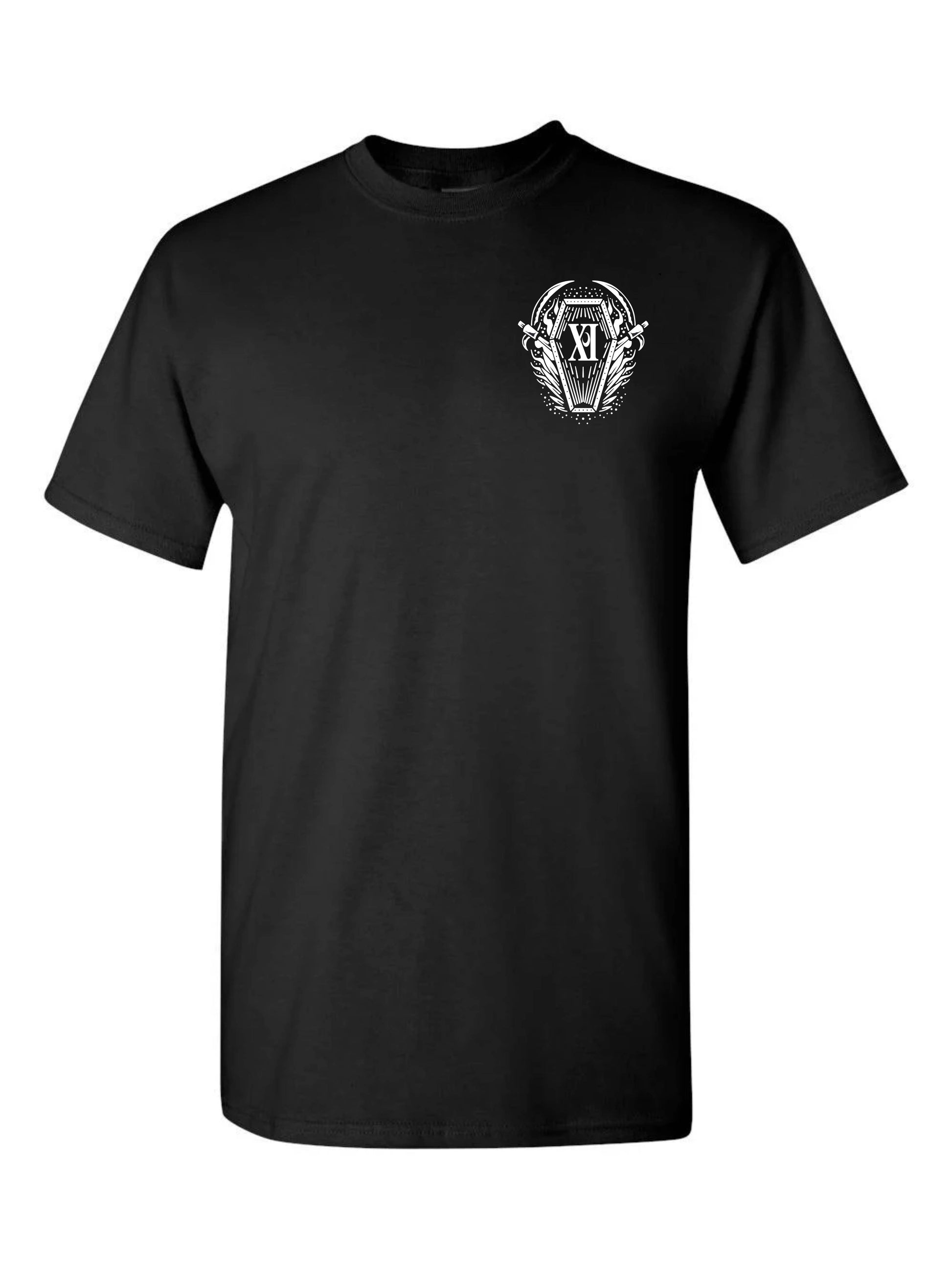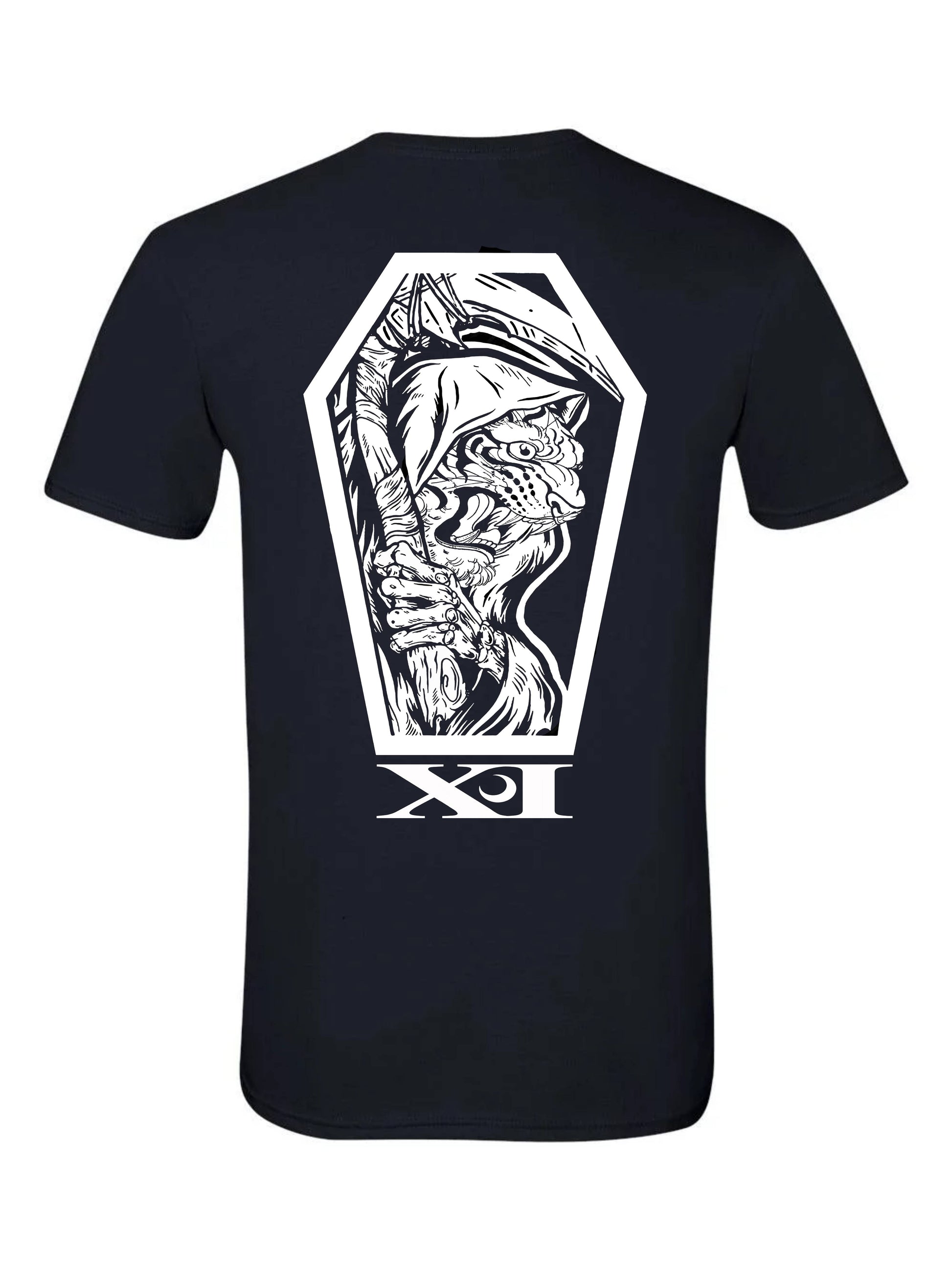The "Tiger Reaper" is printed on a Gildan Ultra Cotton T-shirt. This shirt is sturdy without being bulky and lightweight without being thin or transparent. The artwork is double screen-printed to give a clean solid opaque image. Available exclusively through XI Southern Gothic.